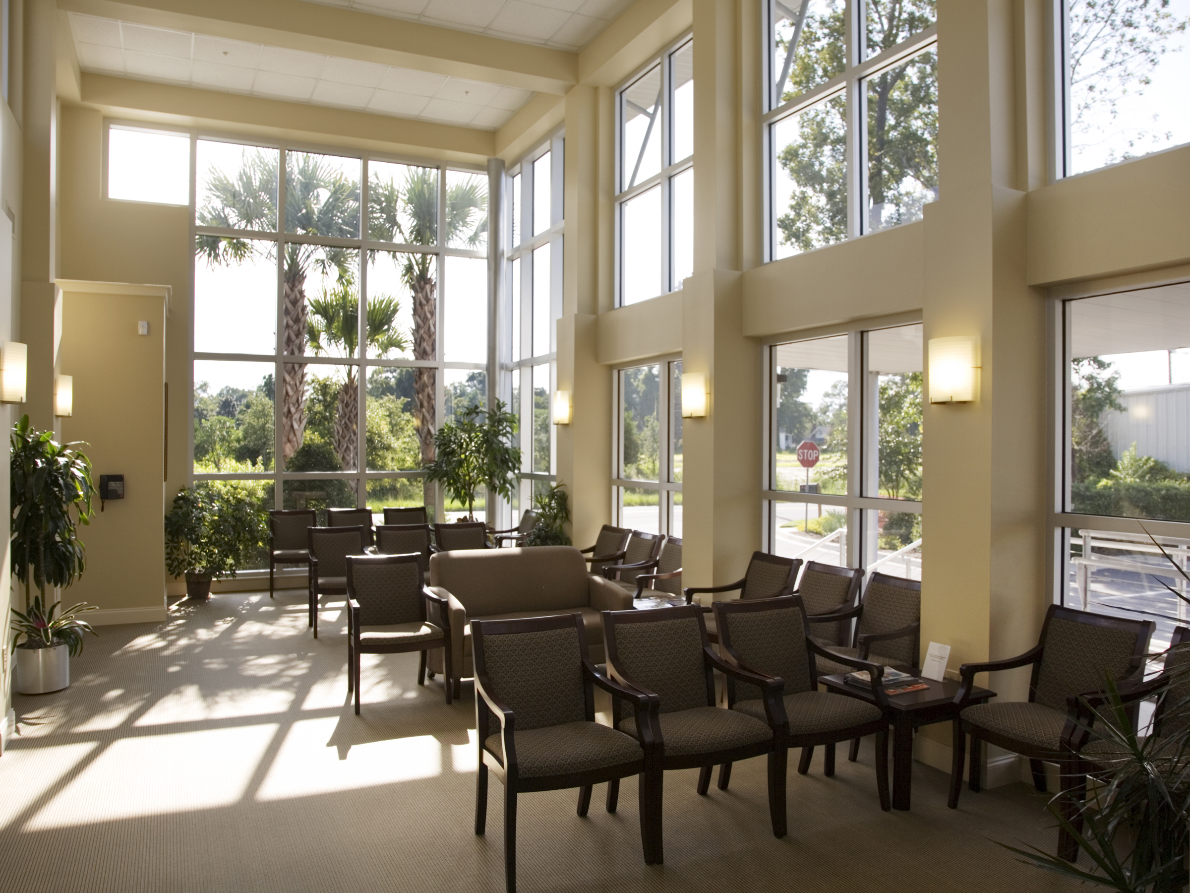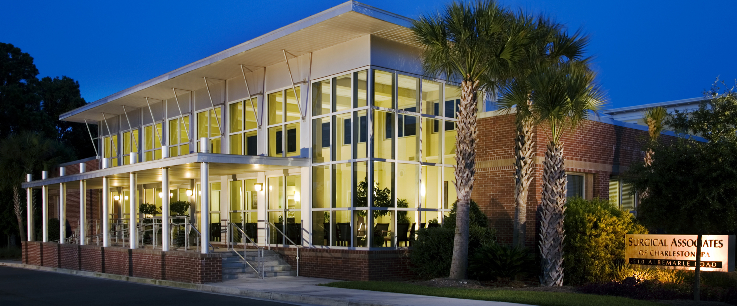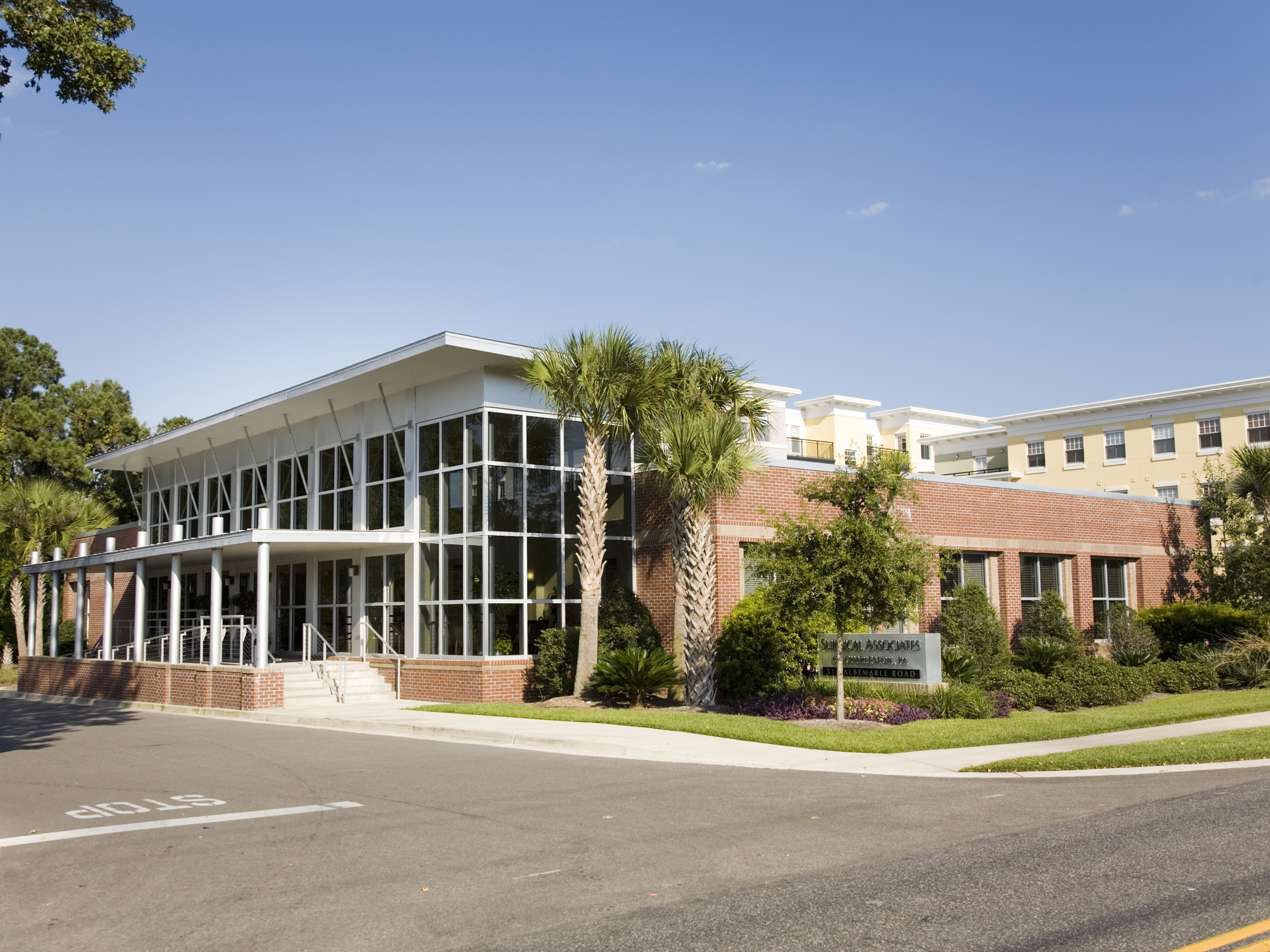 This project was an 8,000 sq. ft. freestanding medical office for a group of five surgeons. The project, located on Albermarle Road in Charleston, is in the City Board of Architectural Review’s jurisdiction.  Elements in the building included: vaulted reception/waiting area, five exam rooms, a procedure room, laboratory, business office, large records/file room, individual doctor’s offices, and support spaces. The building is a contemporary design with brick, glass and aluminum panels. Tubular brackets support the wide overhangs at the reception/waiting space.