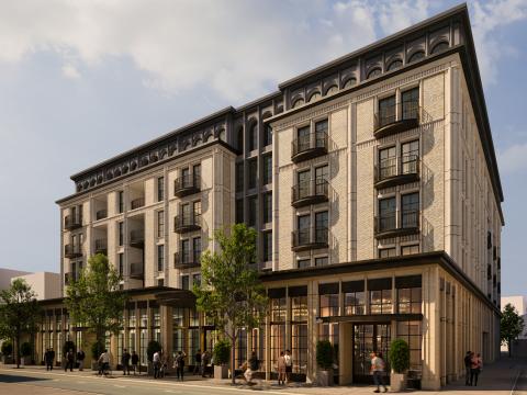 This mixed-use project on Meeting Street includes 118 multi-family units on five floors over a two story parking garage. Three existing buildings on Meeting Street are being adaptively renovated for reuse as retail and amenity space in the project. The project includes an outdoor plaza between the existing building and the new building. |